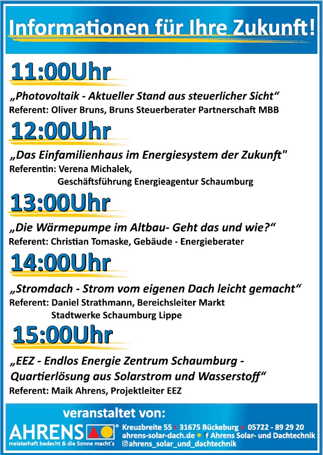 Am Samstag, den 14. Februar 2026 dreht sich alles um das Thema Solar. Regionale Aussteller präsentieren Produkte und Dienstleistungen rund um das Thema. Wir unterstützen die Aktion am Samstag ebenfalls mit unserem Informationsstand im Rathaussaal in Bückeburg. Zudem gibt es stündlich zwischen 11 und 15 Uhr interessante Vorträge rund um das Thema Photovoltaik, wie z.B. steuerliche Aspekte, Wärmepumpen im Altbau und der Vorstellung des Endlos-Energie-Zentrums. Um 12 Uhr wird Verena Michalek, Geschäftsführerin der Energieagentur, das „Einfamilienhaus im Energiesystem der Zukunft“ erläutern.