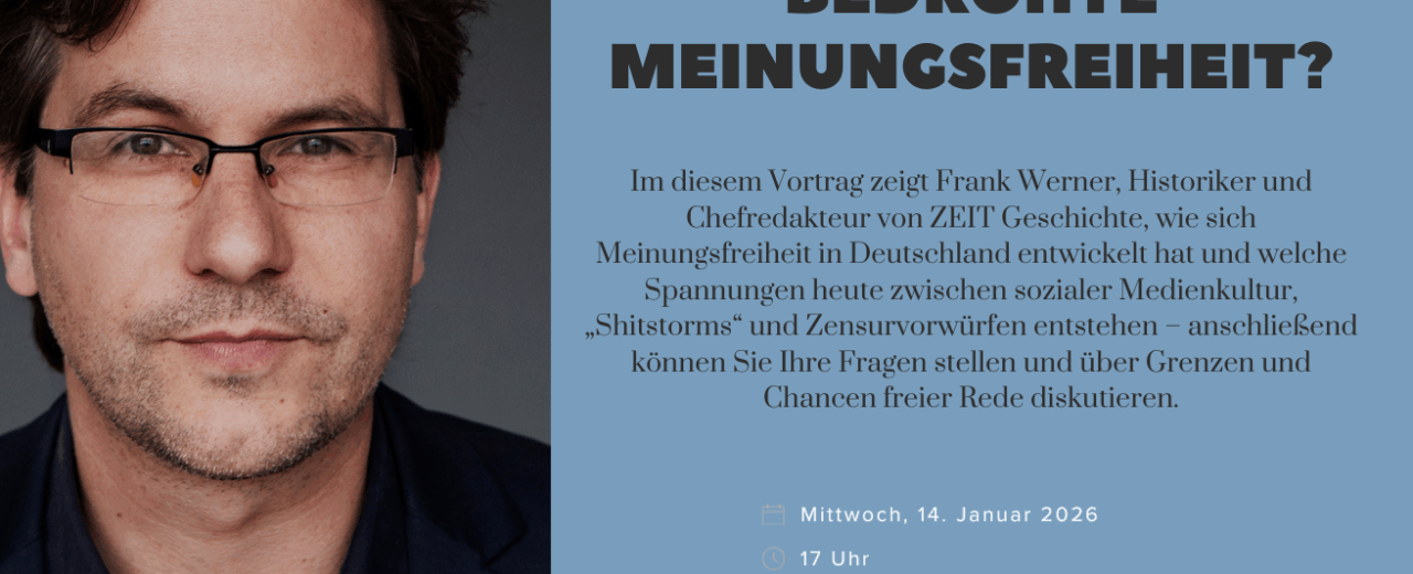 Noch nie war es so leicht, die eigene Meinung öffentlich zu äußern – und zugleich haben viele das Gefühl, bei bestimmten Themen lieber zu schweigen. Im Vortrag „Bedrohte Meinungsfreiheit?“ beleuchtet Frank Werner, Historiker und Chefredakteur von ZEIT Geschichte, wie sich Meinungsfreiheit in Deutschland historisch entwickelt hat und welche Rolle soziale Medien, „Shitstorms“ und Vorwürfe von Zensur heute spielen. Im Anschluss besteht die Möglichkeit, Fragen zu stellen und gemeinsam über Grenzen und Chancen der freien Rede zu diskutieren.