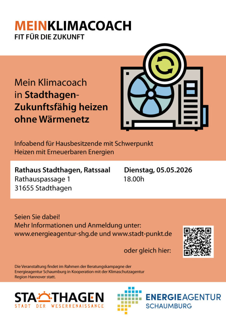 Die Veranstaltung ist Teil der Beratungskampagne der Energieagentur Schaumburg in Kooperation mit der Klimaschutzagentur Region Hannover. Die Teilnahme ist kostenfrei.