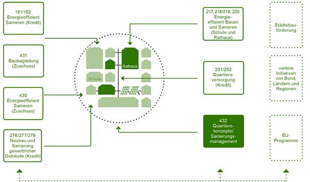 Das KfW-Programm „Energetische Stadtsanierung – Klimaschutz und Klimaanpassung im Quartier“ (Programmnummer 432) selbst verknüpft Anforderungen an die energetische Gebäudesanierung, effiziente Energieversorgungssysteme und den Ausbau erneuerbarer Energien mit demografischen, ökonomischen, städtebaulichen und wohnungswirtschaftlichen Fragestellungen.