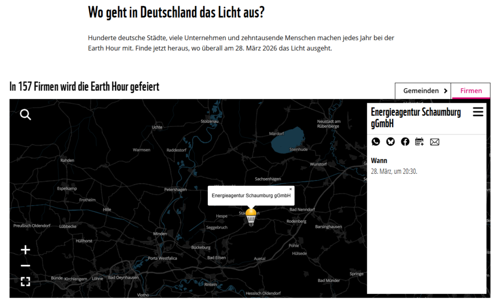 Auch die Energieagentur Schaumburg macht mit. Finden Sie unsere Agentur auf der weltweiten Earth Hour-Karte im Internet.