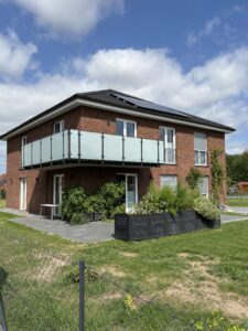 Der Neubau aus dem Jahr 2023 besticht durch seine moderne, nachhaltige Architektur und eine klare, harmonische Gestaltung: Roter, warmer Klinker an der Fassade, weiße Fenster und ein dunkles Dach prägen das Erscheinungsbild. Energetisch setzt das zweigeschossige Gebäude auf neueste Technologien: Eine Photovoltaikanlage mit Speicher, eine Sole/Wasser-Wärmepumpe einschließlich Warmwasserspeicher, die Nutzung von Umweltwärme sowie eine Wohnraumbelüftung mit Wärmerückgewinnung sichern einen effizienten und ressourcenschonenden Betrieb. Ergänzt wird das Energiekonzept durch die Möglichkeit regenerativer Kühlung in den Sommermonaten. Der Balkon mit Glaselementen verleiht dem Haus eine moderne Transparenz und lädt zum offenen Wohnen ein. Das Haus ist barrierefrei und behindertengerecht gebaut und damit optimal auf die Bedürfnisse aller Generationen vorbereitet. Ein Aufzugseinbau ist bereits eingeplant, sodass die langfristige Wohnnutzung gesichert ist. Zudem kamen umweltverträgliche Baustoffe zum Einsatz: Klinker und Dachziegel stammen aus regionaler Produktion, weitere Bauelemente wurden ressourcenschonend wiederverwendet. Mit einer geringen Wohnfläche von 43,25 Quadratmetern pro Person setzt das Gebäude ein klares Zeichen für nachhaltigen Umgang mit Ressourcen – sowohl im Energieverbrauch als auch in der Flächennutzung.