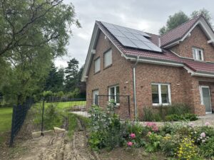 das Wohnhaus aus den Jahren 1948 bis 1950 wurde umfassend energetisch saniert und von der Effizienzklasse H auf A verbessert. Herzstück ist eine Photovoltaikanlage mit 19,5 kWp und 19 kWh Speicher, deren Strom über Sektorenkopplung für Haushalt, Wärme und Mobilität genutzt wird; ergänzt wird dies durch eine Wärmepumpe sowie die Dämmung von Dach, Außenwänden und Kellerdecke sowie neue Fenster, Türen und Anlagentechnik. Die laufenden Energiekosten liegen nach Abzug der Einspeisevergütung heute etwa bei null. Auslöser für das auf Versorgungssicherheit ausgerichtete Konzept war die Schneekatastrophe 2005 im Münsterland und die Sorge vor längeren Stromausfällen. Das Haus ist heute nahezu autark, da Stromerzeugung, -speicherung und -nutzung auf dem eigenen Grundstück gebündelt sind. Trotz anfänglicher Probleme mit der Wärmepumpe hielten die Eigentümer an dieser Technik fest, gestützt auf langjährige positive Erfahrungen im Elternhaus, und schufen so ein historisch geprägtes Gebäude, das krisenfest, klimafreundlich und nahezu energiekostenfrei betrieben wird.